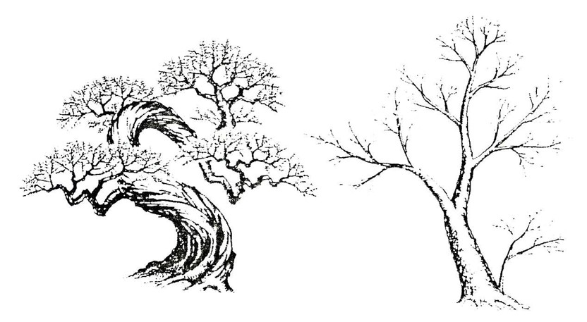 Một bên thì thân và nhánh gấp khúc quá nhiều tạo cảm giác dày và chật chội, tập trung theo xu hướng hoài cổ. Đố chính là đặc điểm “thu”. Còn bên kia thì cả thân và nhánh đều tương đối thẳng, xú hướng rõ tàng độ khai phóng lớn, đó là đặc điểm “phóng”,
