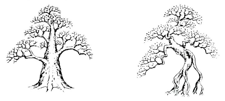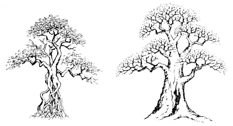 Thông qua các vết sẹo, hốc cây và rễ cây kiểu “bàn lộ”, hình bên trái được toát lên chủ để “cổ xưa” ngay khi vừa mới đập vào mắt người xem. Hình bên phải là đối kháng của hình tượng cổ bởi những đặc tính cổ đã được giảm đi mặc dù cả hai đều có tư thế giống nhau. Đó chính là đặc điểm của “Nhã”.