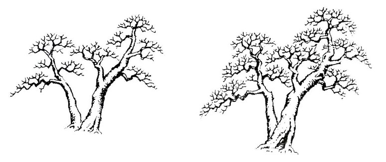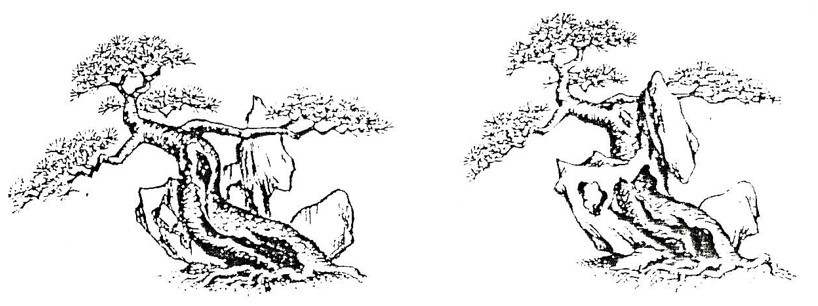 Cảm giác “động” ở hình bên trái thể hiện rất rõ nét thông qua sự đối kháng giữa thân và nhánh (xem phần “kiểu phong xúy”) làm chuyển đổi từ thế không cân bằng sang thế cân bằng, còn hình bên phải lại thể hiện tư thái ôn hòa, bình thản đó chính là cảm giác “tĩnh”.